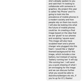 Figures 4-7 (O'Connor, 2022. Screenshots of direct messages relating to collaboration) display the screenshots of the messages sent, discussing a potential collaboration. A brief explanation of the project followed by the design idea was sent. The student from graphics was more than happy to collaborate on this project.